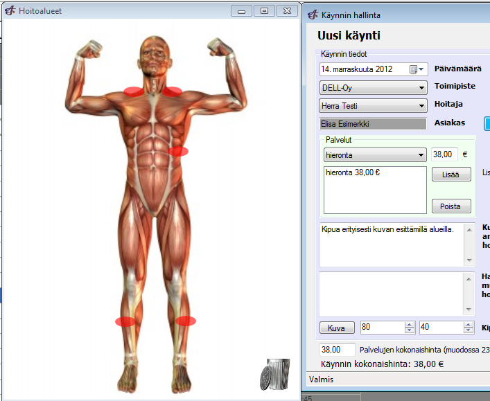 Lisäsimme Asiakashallinta-ohjelmaan hierojille, fysioterapeuteille ja osteopaateille kohdennetun mahdollisuuden merkata kuvaan kipeitä ja hoidettuja alueita.