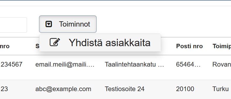 Toiminto löytyy asiakkaat-listauksen yläpalkista ja sen avulla järjestelmä näyttää ehdotukset samanlaisista asiakkaista, jotka voidaan yhdistää samaksi kortiksi.